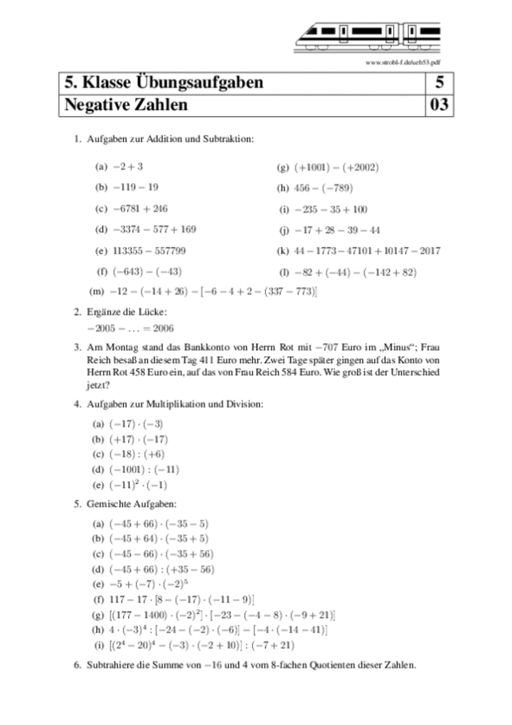 Arbeitsblatt Negative Zahlen Klasse 7