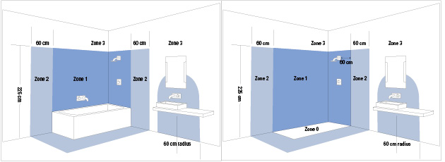 Bei flächen bis auf eine höhe von 2,25m rund um duschbrause und badewanne oder duschwanne ist die ip65 die richtige schutzart für ihre leuchten.